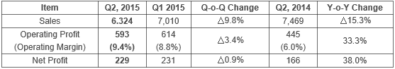 Q2 sales declined 15.3% to 632.4 billion won from the same period one year ago, but operating profit soared 33.3% to 59.3 billion won during the same period.