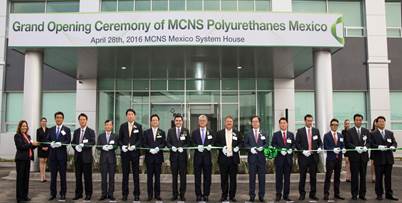 Mitsui Chemicals & SKC Polyurethanes Inc.(MCNS), a joint venture of SKC(CEO Lee Wan Jae) and Mitsui Chemicals(President & CEO: Tsutomu Tannowa), held a ceremony to celebrate the opening of its new polyurethane system house in Monterrey in the Mexican state of Nuevo León on April 29, 2016. The ceremony was attended by more than 100 guests including Shin Won Choi, Chairman of SK Networks, Wan Jae Lee, CEO of SKC, Samuel Pena Guzman, Deputy Minister of Economic Development of Nuevo León, Gonzalo Elizondo Lira, mayor of Salinas Victoria, Kook Bo Yang, Chief Director General of the Central and South America Office of KOTRA, and Ki Don Won and Shingo Shibata, Co-CEOs of MCNS. The factory in Mexico is now capable of commercially producing 20,000 tons of polyurethane system products annually only nine months after its construction began in June 2015. The system house manufactures customized polyurethane materials such as MDI and Polyols mixed with additives.