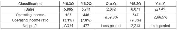 ㅁ 3rd quarter sales of 162.6 billion won, operating income of △19.7 billion won