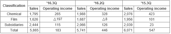- The film line posted 162.6 billion won and △19.7 operating income, reflecting the restructuring expenses of the film business to overcome the continued slow business of the key downstream industries, including mobile and display appliances.