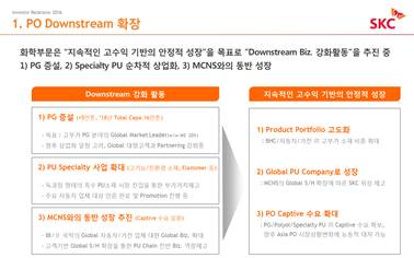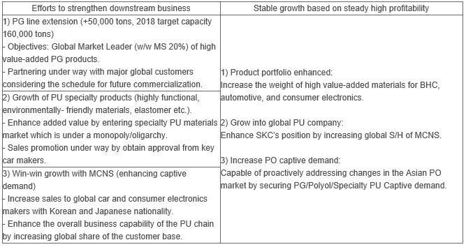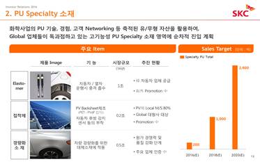 SKC plans to enter the markets for highly functional PU specialty products currently monopolized by global p s, by utilizing the tangible and intangible assets - including PU technology, experience and customer networking - of the chemical business line.
