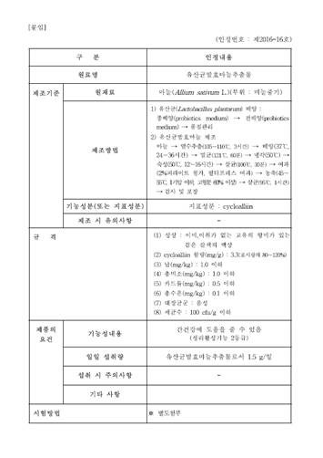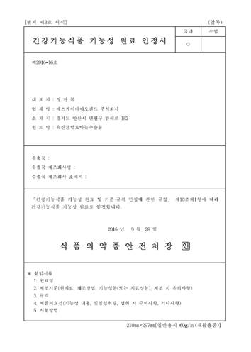 1. Certificate of approval for functional raw materials for health supplements (issued by the KFDA Administrator on 28 September 2016)