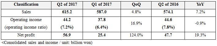 ● 615.2 billion won in sales and 44.2 billion won in operating income posted, attaining the upper end of the 2nd quarter forecast presented in its Q1 earnings announcement