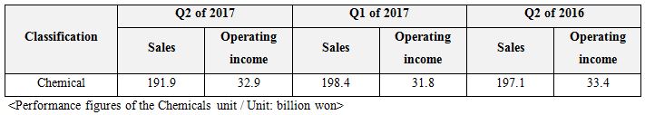Chemicals unit posts 191.9 billion won in sales, 32.9 billion won in operating income, and operating income ratio of 17.1% for the 2nd quarter
