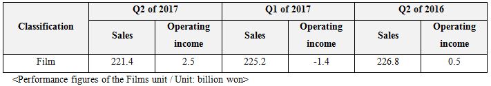 Films unit posts 221.4 billion won in sales, 2.5 billion won in operating income, and operating income ratio of 1.1% for the 2nd quarter