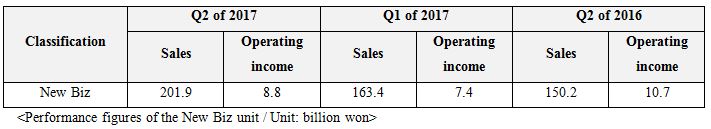 New Biz unit posts 201.9 billion won in sales, 8.8 billion won in operating income, and operating income ratio of 4.4% for the 2nd quarter