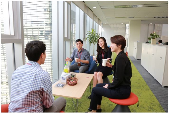 < SKC constituents chatting pleasantly at a “collaboration belt” located near windows on each floor of the new office building>