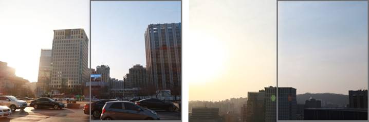 The effect is more powerful when in a car in the morning when the sun is low or when driving in the direct direction of the sun in the afternoon. The driver can drive the car with far better safety and comfort even when facing the sun since the film blocks strong yellow light from the sun. In addition, the film lets the driver enjoy clear view and relatively more blue sky by reducing the light dispersion effect from dust on days when yellow dust is strong. The driver can look at the front more clearly even in a situation wherein a car is coming head-on in the opposite lane with the headlights on.