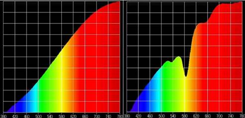 <Before (left) and after (right) installing Neosky on the spectrum photometer. The yellow wavelength has drastically decreased in the right image.>