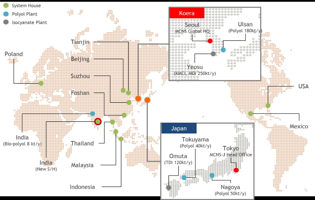 Established in 2015, MCNS is a joint venture company wherein SKC and Mitsui Chemicals have a fifty percent share. The company was set up by spinning off their polyurethane divisions. MCNS currently has 17 production bases in 10 different countries, with annual production capacity of 750,000 tons and total annual sales of approximately KRW 1.2 trillion. [End]